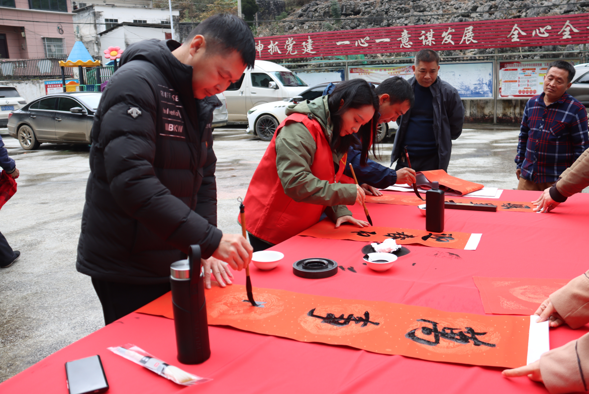 活動現(xiàn)場翰墨飄香、紅紙翻飛,我們有才氣的高級經(jīng)理梁煜以及兩位志愿者揮毫潑墨,以字傳情,把美好的愿望寫進(jìn)春聯(lián)里。不一會兒,一幅幅散發(fā)著清新墨香的春聯(lián)接連呈現(xiàn),一張張滿含祝愿的“福”字揮灑而成。其他志愿者分工合作、相互配合,有的拉紙研墨,有的配春聯(lián)、曬“福”字,有的拿剛寫好的對聯(lián)仔細(xì)擺放晾干。一位村干部激動地說:“這個時候送春聯(lián)對于村民們來說是最實(shí)用了,而志愿者現(xiàn)場寫的春聯(lián),里面包含著滿滿祝福,讓大家感受到了后盾單位的溫暖!”